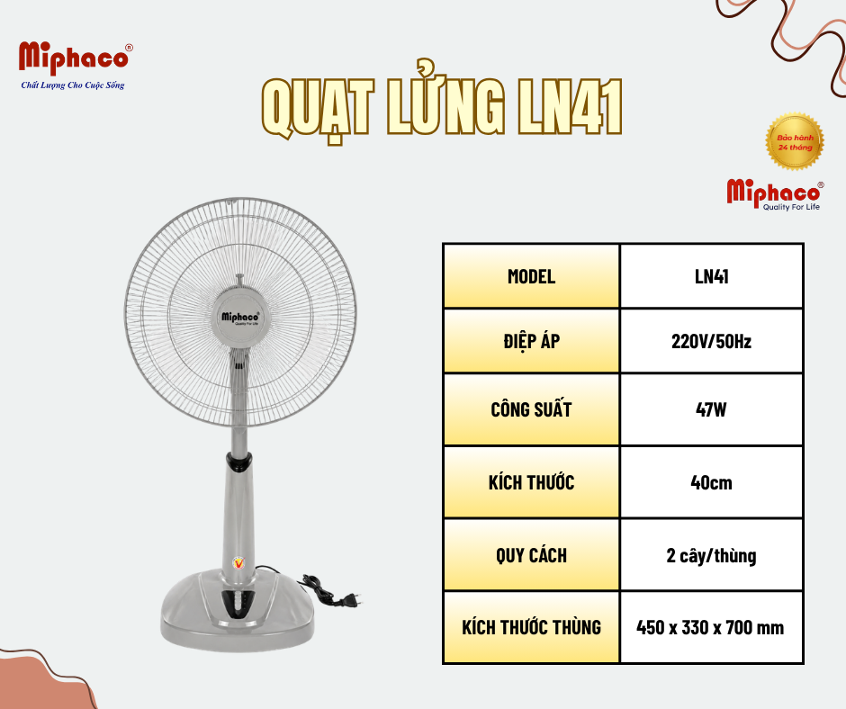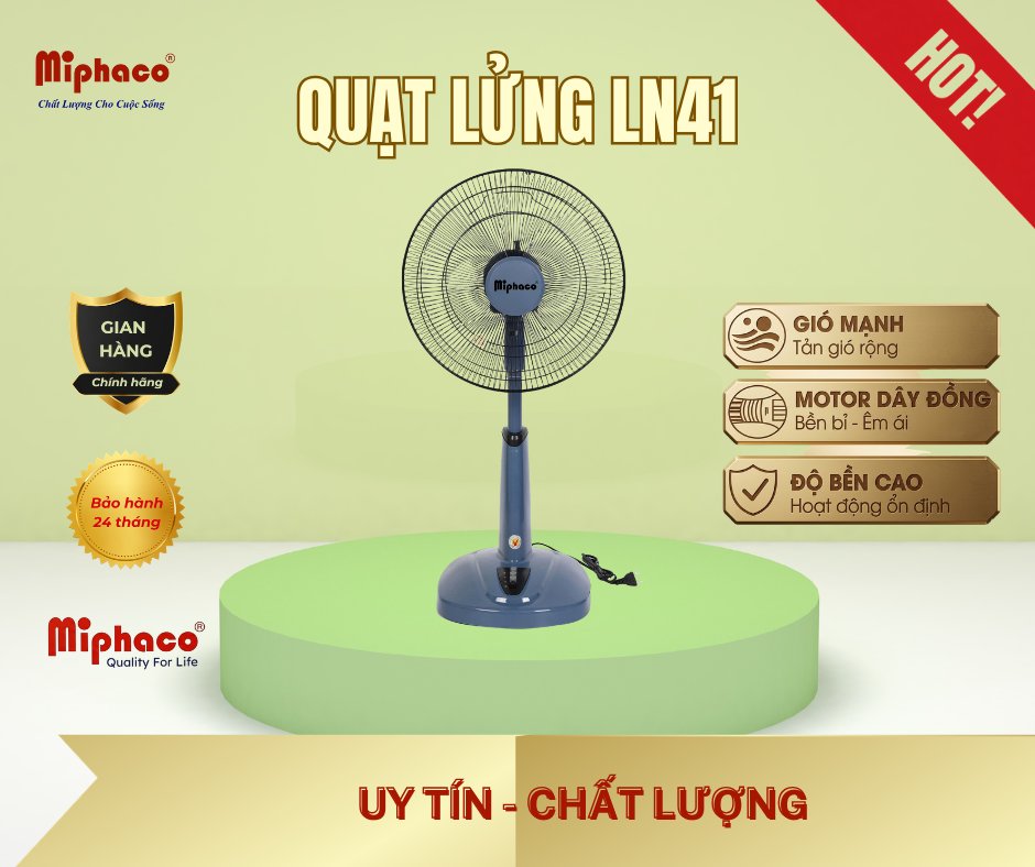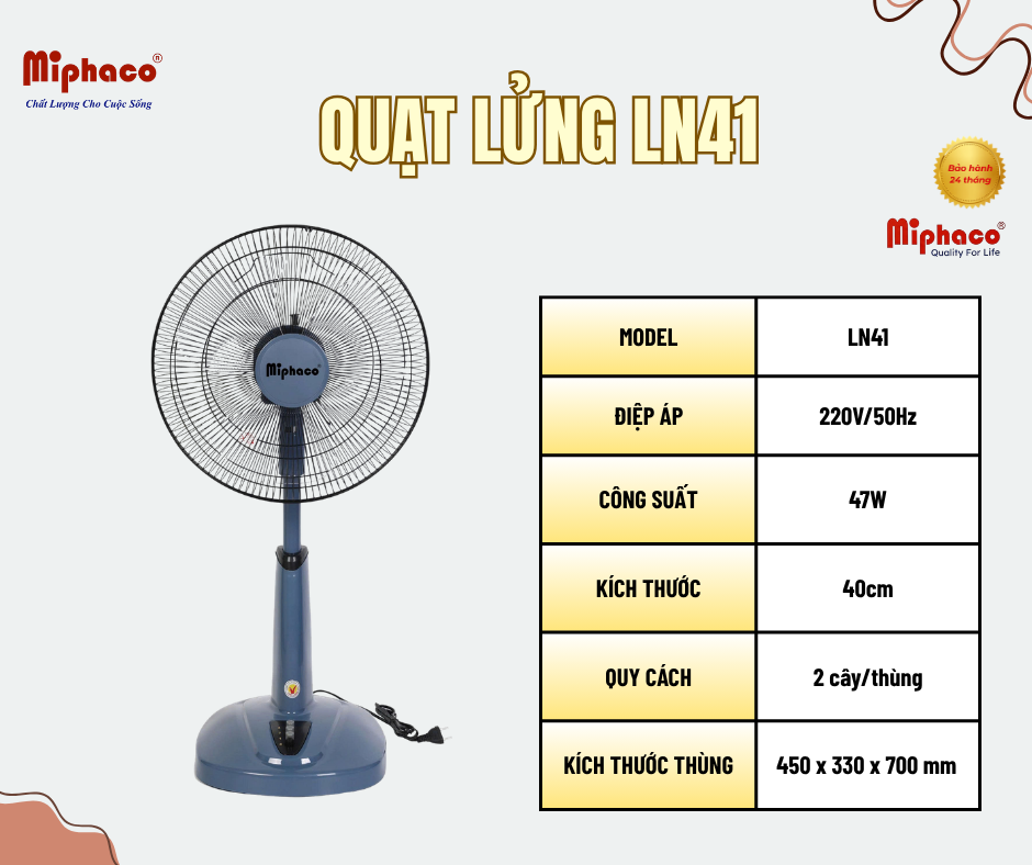 Quạt lửng LN41 là lựa chọn lý tưởng cho những không gian cần sự linh hoạt và tiện dụng. Thiết kế chắc chắn, chiều cao vừa phải giúp dễ dàng di chuyển và sử dụng ở nhiều vị trí khác nhau như phòng khách, phòng ngủ hay văn phòng.