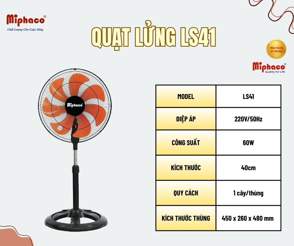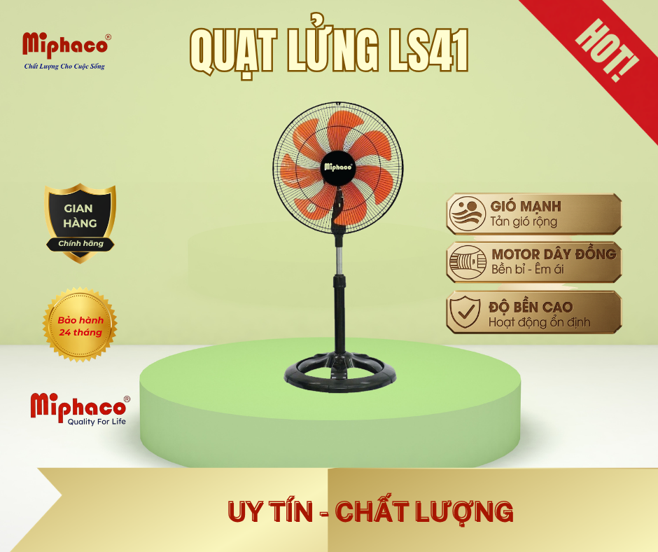 Quạt lửng LS41 từ Miphaco là lựa chọn lý tưởng cho nhu cầu làm mát hiệu quả và ổn định. Với thiết kế thân sắt chắc chắn, sản phẩm mang lại độ bền cao, phù hợp sử dụng trong gia đình, văn phòng hoặc không gian cần hoạt động liên tục.